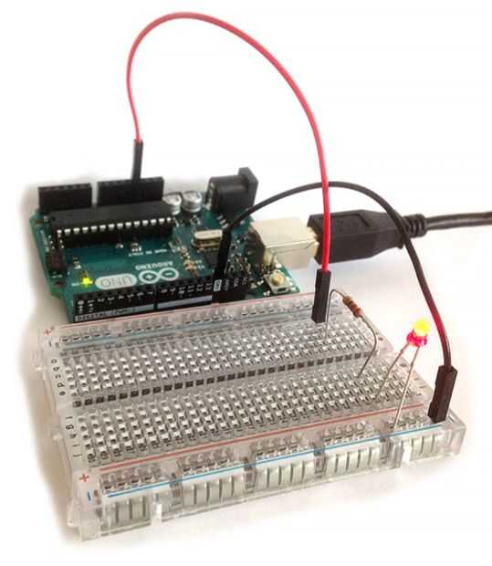 El LED debe permanecer ahora en continuamente. En este caso, Arduino no está enviando ninguna señal al LED, sólo proporciona 3,3 voltios de electricidad.