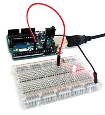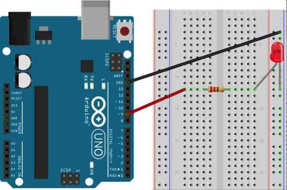 //Fade //This example shows how to fade an LED on pin 9 using the analogWrite() function. //This example code is in the public domain. int led = 9; // the pin that the LED is attached to int brightness = 0; // how bright the LED is int fadeAmount = 5; // how many points to fade the LED by // the setup routine runs once when you press reset: void setup() { // declare pin 9 to be an output: pinMode(led, OUTPUT); } // the loop routine runs over and over again forever: void loop() { // set the brightness of pin 9: analogWrite(led, brightness); // change the brightness for next time through the loop: brightness = brightness + fadeAmount; // reverse the direction of the fading at the ends of the fade: if (brightness == 0 || brightness == 255) { fadeAmount = -fadeAmount ; } // wait for 30 milliseconds to see the dimming effect delay(30); } El código dice que el Arduino para lentamente de la rampa hasta la cantidad de electricidad que fluye por el circuito hasta que alcanza un brillo máximo y luego lentamente la rampa hacia abajo en un bucle infinito.