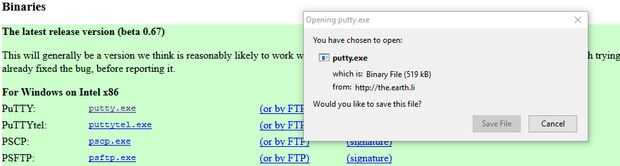 - Abra la siguiente www.putty.org/ enlace. Para descargar siga masilla imagen 1. La siguiente ventana aparecerá como se muestra en la imagen 2. Haga clic en el Putty.exe y haga clic en para guardar el archivo. Abra la carpeta donde se descarga el archivo y haga doble clic para abrir como se muestra en la imagen 3 y 4.