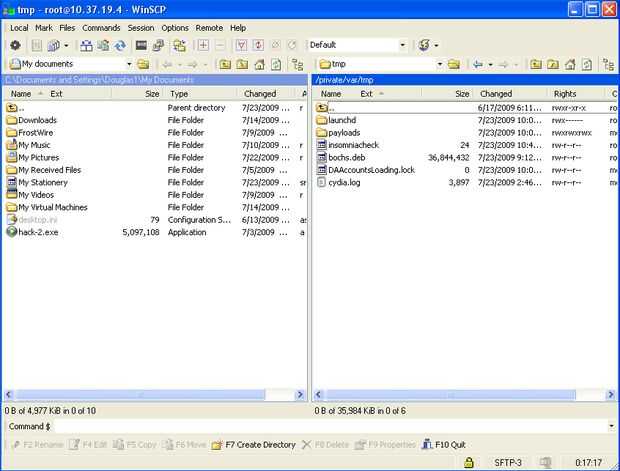 abrir WinSCP o CyberDuck y conectar el iPod a través de SSH. seguir subiendo directorios hasta su justa en / y tmp. Agregue el archivo bochs.deb en ese directorio. allí, se inserta el archivo.