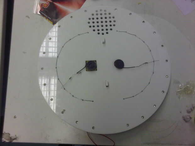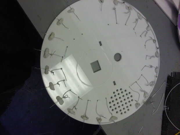 Se sientan los 20 LEDs en los círculos de corte, colocando las patas positivas hacia adentro y las patas negativas hacia la base.