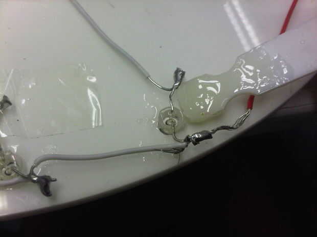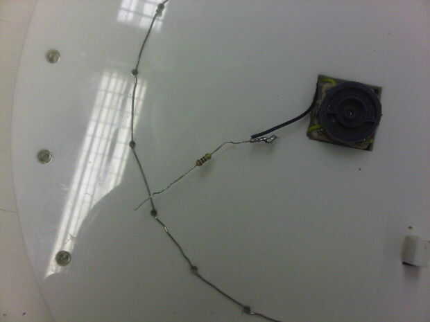 Finalmente, la soldadura de resistencia de ohmios 2 x 27 a 2 cables, uno para cada esfera. Gancho a través del agujero central de base de plástico y luego de la soldadura de estas para el lado positivo de la batería.