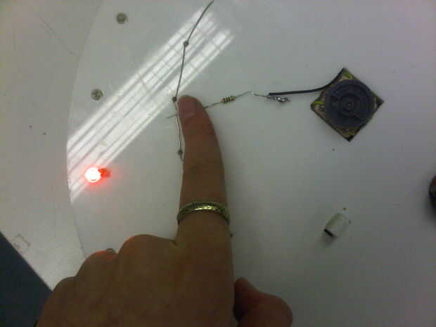 Usted debe encontrar que cuando tocas los resistores de alambre liso su LED se iluminará!