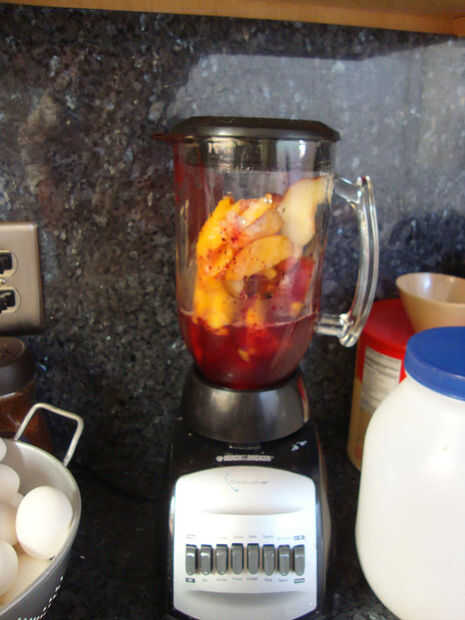 Ponga alrededor de la mitad de la fruta en la licuadora.  Vierta aproximadamente la mitad del agua de azúcar sobre él.