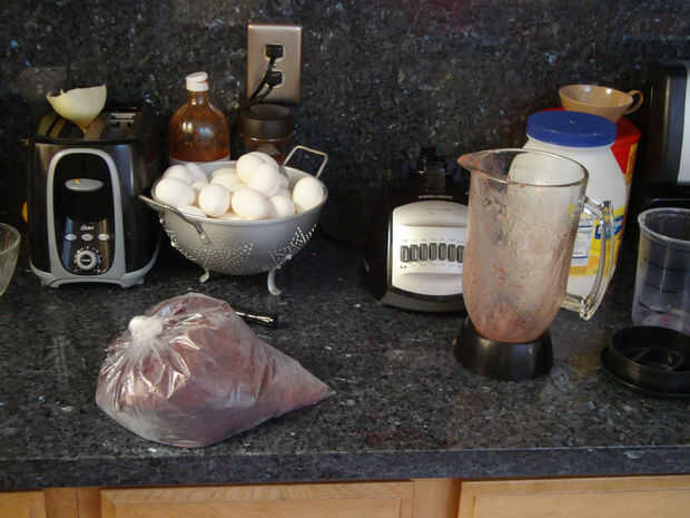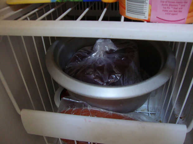 Asegúrese de que el agua de azúcar es todavía lo suficientemente caliente como para ser líquido. Ponga el resto de la fruta en la licuadora. Vierta el resto del agua azúcar encima. Mezclarlo para arriba. Vierta en la bolsa también y cierre firmemente. Coloque la bolsa en el recipiente Coloque el recipiente en el congelador.