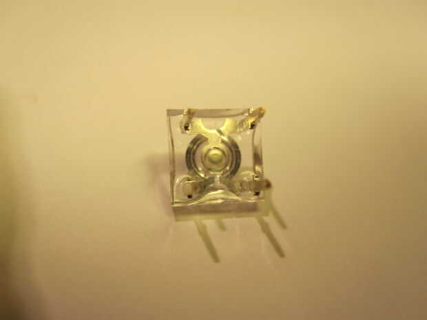 A continuación, obtener su LED y dar su parte inferior un buen cierre mirando, con una lupa si es necesario. Dentro de la película de plástico transparente, uno de los cuatro pasadores es cableado diferente a los otros tres. (véase la foto) Este es el pin común (Estoy suponiendo, como yo, utiliza LEDs de ánodo común). Tome nota de este pin, no lo suelta. Empuje el LED en el tablero de pan, en un ángulo de 45 grados, esto permite que cada pin del LED en una pista diferente en el tablero de pan. Retire ahora el LED una vez más, porque ha olvidado que pin es el común, buscar y pulsar otra vez de nuevo en.