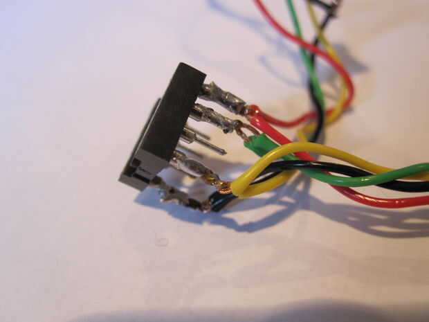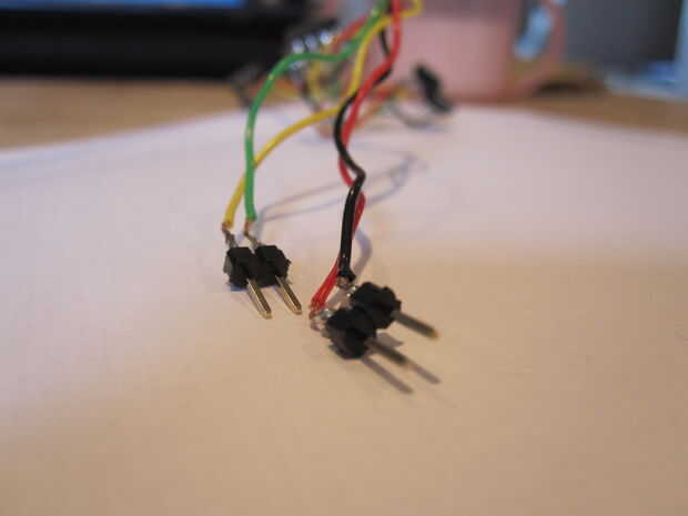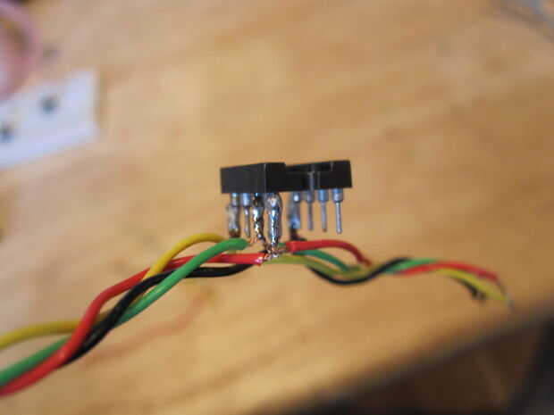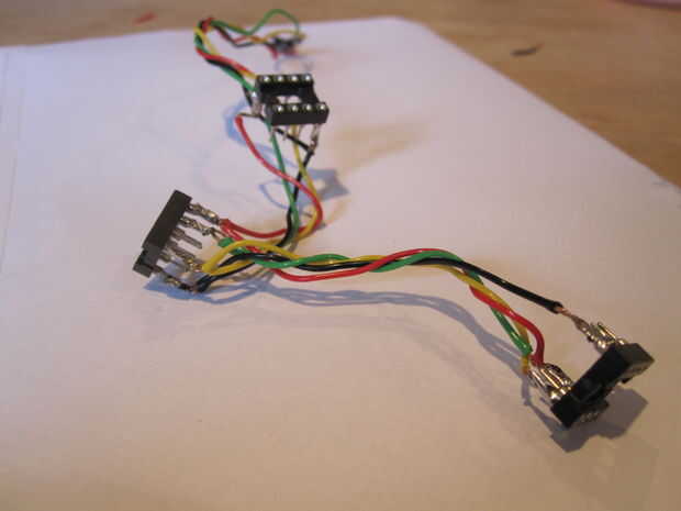 Ahora usted puede comenzar a conéctelos todos juntos. Esto requiere nada pero de alambre, simplemente conectan todos los pines del mismo tipo entre todos los píxeles. Construí un arnés con zócalos DIP para hacer esto, aunque podría soldar directamente sobre los pasadores de la uC, o ponerlos todos en perfboard... lo que sea, depende de usted.