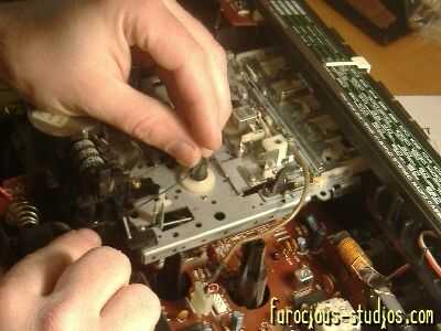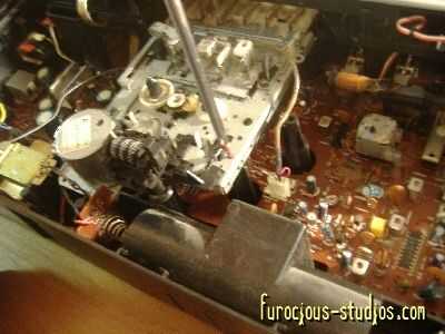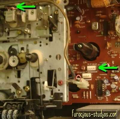 La primera orden del día fue para cuidadosamente quitar la platina de cassette, teniendo en cuenta que puede ser necesito volver a propósito de algunas de las partes. El show de las flechas verdes donde los cables conectan la cabeza de la cinta a la placa de circuito. Pensé que sería bueno utilizar los cables con el conector de 3 clavijas para conectar los auriculares de salida a la Junta... ah pero a un punto en blanco en cualquier parte de la Junta.