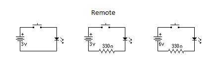 Hay una pequeña variación en LEDs IR algunos ejecutan en 3 voltios alguna corrida de 6 volts con una resistencia por lo que tendrá que jugar para conseguir el transmisor justo.
