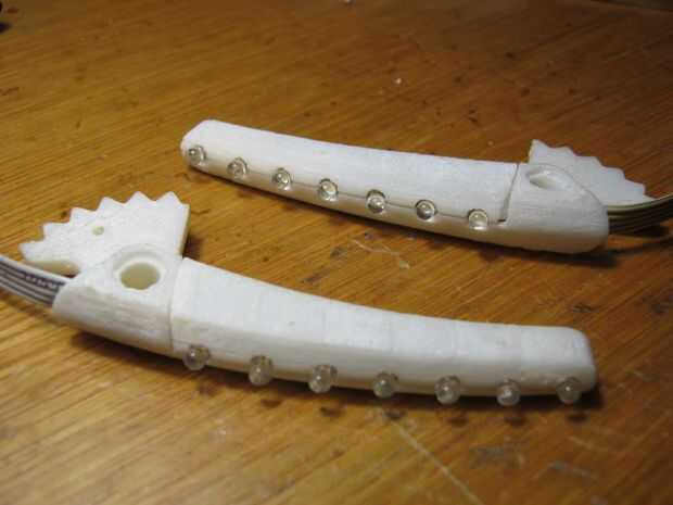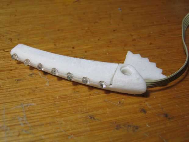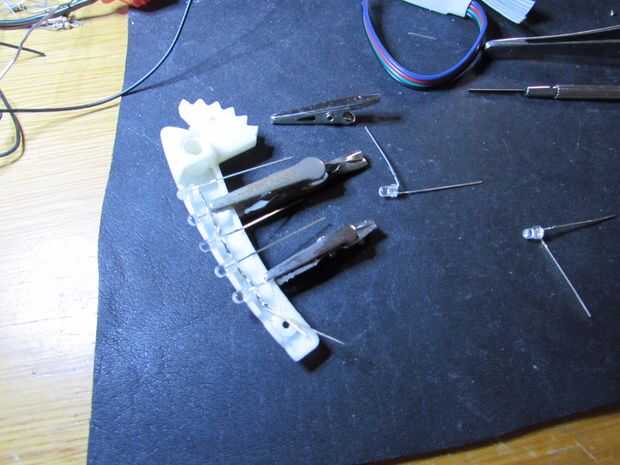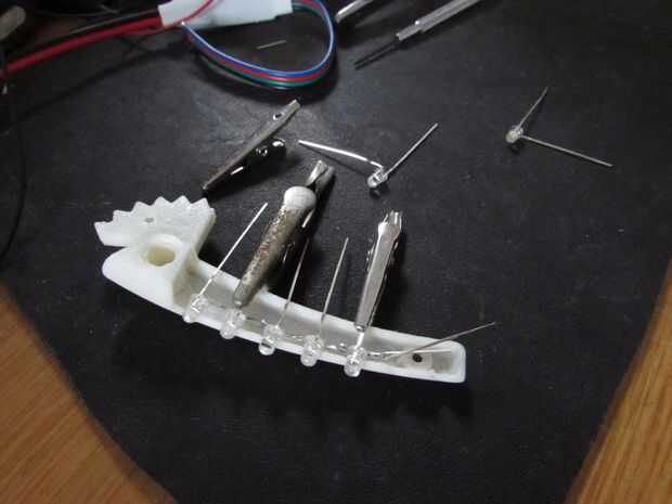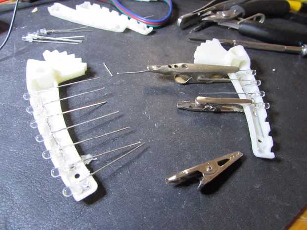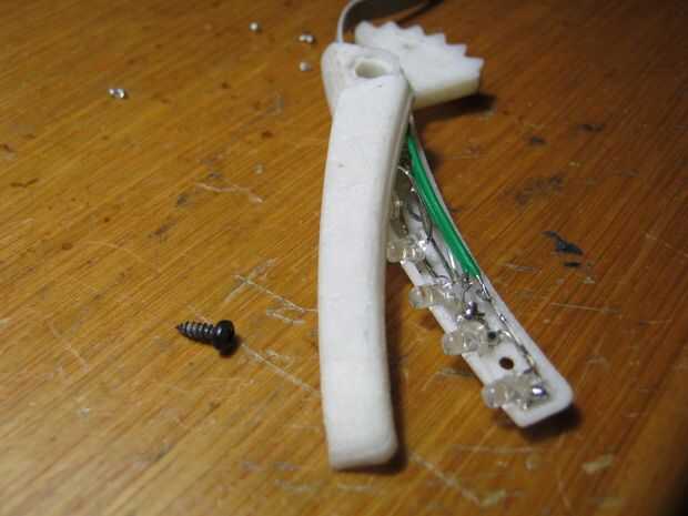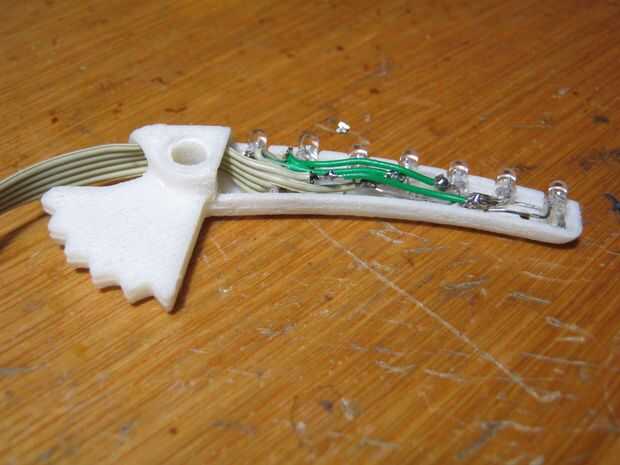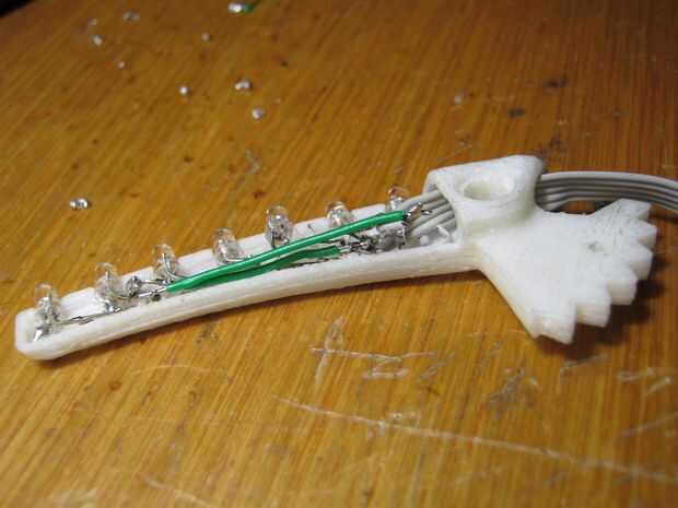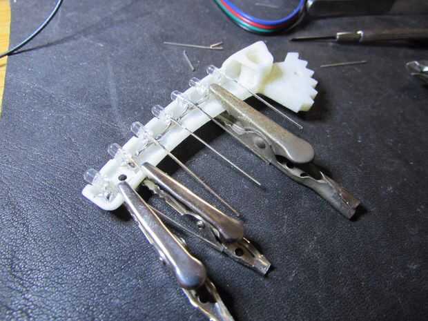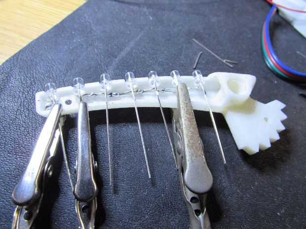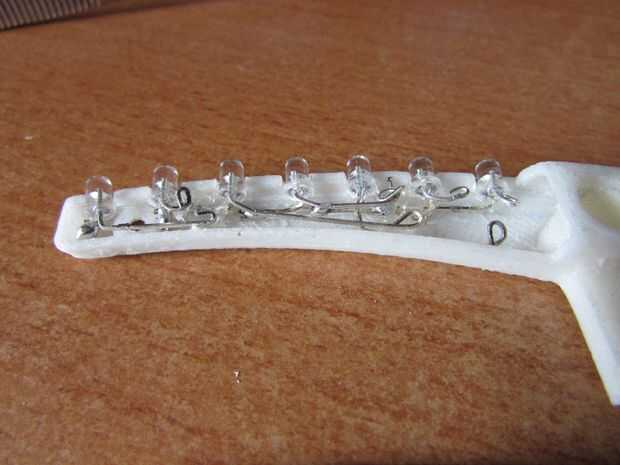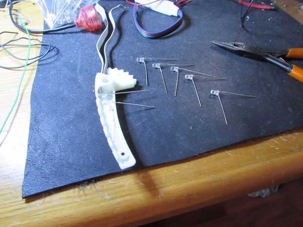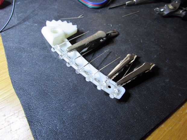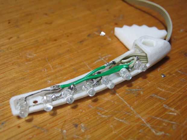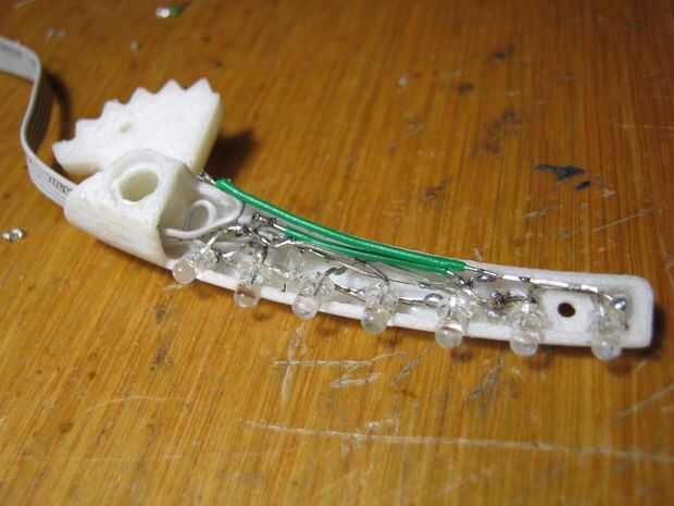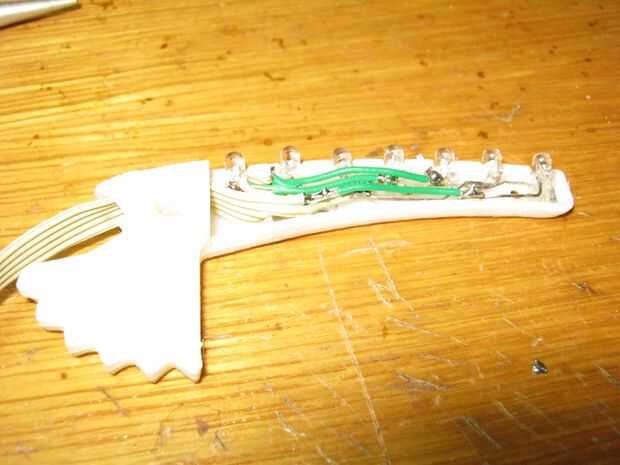 Montaje de las antenas es un poco difícil ya que hay una cantidad muy limitada de espacio en el interior. Todavía es bastante adecuado y he conseguido montar el cableado necesario para encendidos todos los 7 leds. He utilizado multi roscadas y cables muy flexibles sacados de viejas impresoras. Si no puede encontrar los alambres finos y fiexible bastante para el trabajo, podría instalar cableado para 3 LED en cada lado y enciende por soldadura dos en paralelo. Los originales pke meter antena LED también trabajan en paralelo.