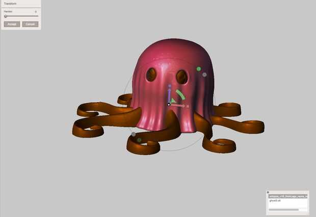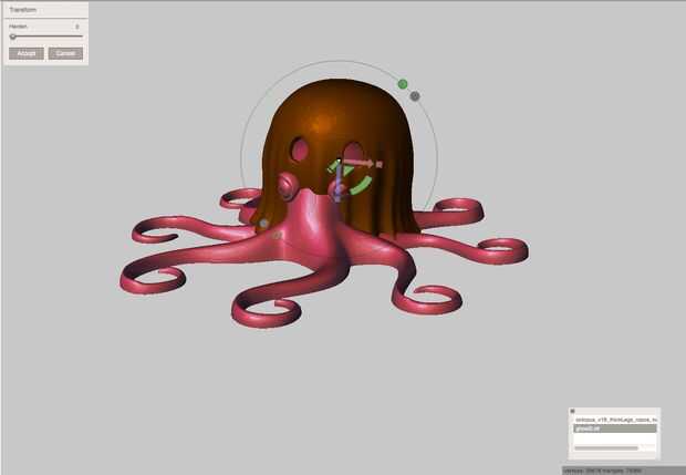 4) deforma elegir--> transformación de la misma barra de herramientas. Esto le permite girar y mover el modelo utilizando las asas color 3 que surgen. Cada color representa un eje. Si haces clic en la flecha mueve el modelo en este eje si haces clic en el arco que está girando y si pinchas en la caja de cambio de tamaño o escala del modelo, pero sólo en ese eje. Seguir adelante y mueva a su espíritu hasta que la máscara se enfrenta a la forma correcta en el pulpo y luego utilice el cuadro para ampliar tu fantasma para caber en la cabeza de pulpo.