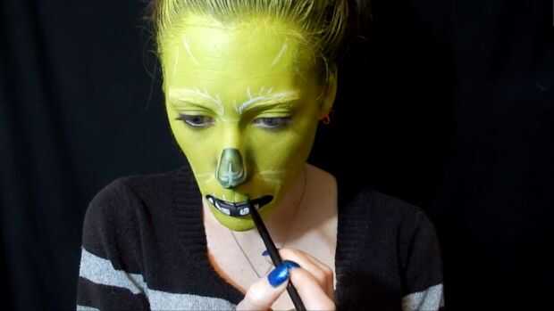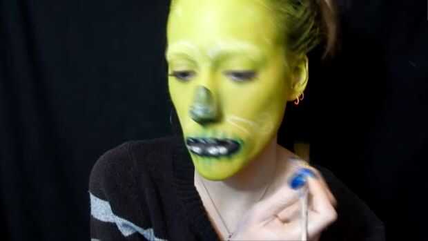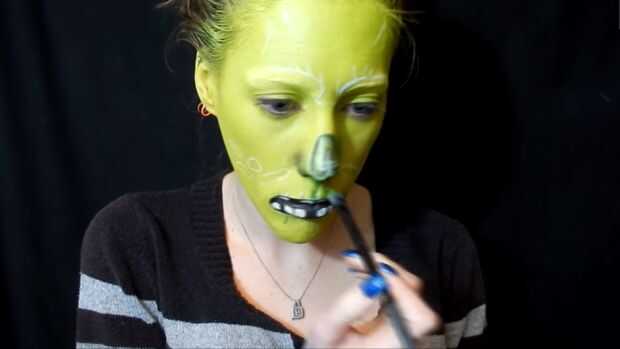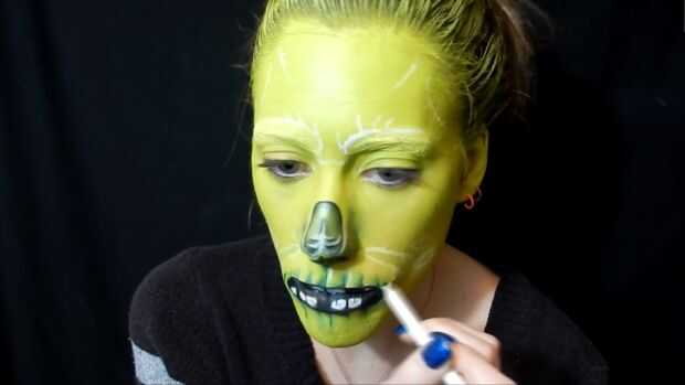 Con pintura de cuerpo verde pongo las líneas alrededor de la boca, también utiliza sombra de ojos verde a la sombra y el delineador de ojos blanco para resaltar.
