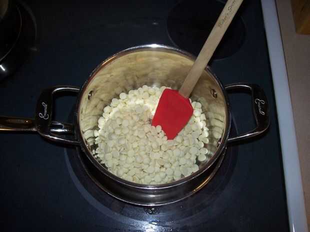 Fuego lento, agregue las chispas de chocolate hasta que se derritan.  Trate de no dejar que el agua haga contacto con el chocolate.
