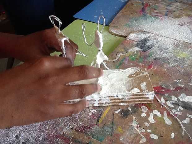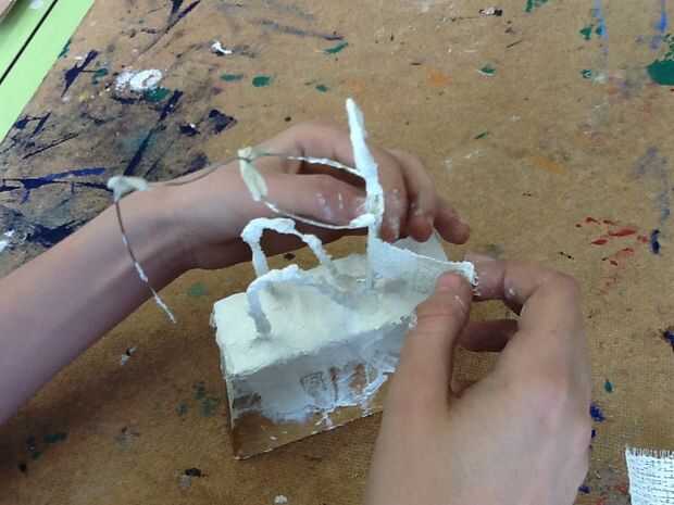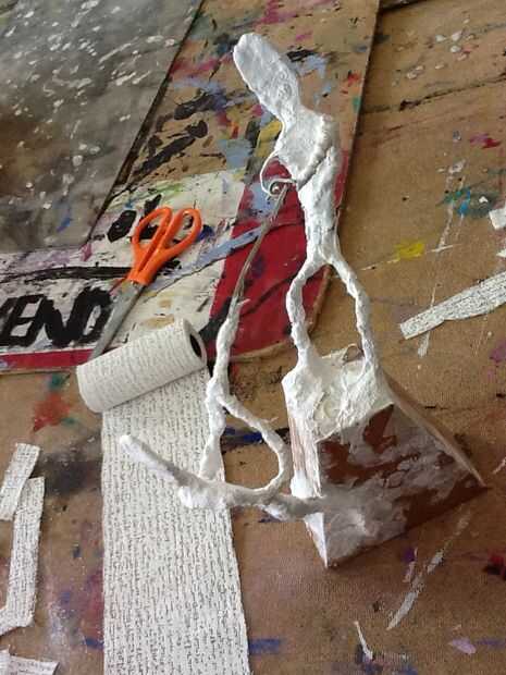 Después recorte suficiente cinta de yeso puede vestir la figura de alambre con él. A tan sólo una pieza en un recipiente con agua durante unos segundos. No largo o usted terminará sólo con el paño después arrastrado el yeso fuera de él.