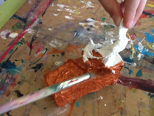 Primero pinta todo el objeto en un color de bronce pintura acrílica, esto le dará un aspecto muy brillante, "bling-bling". Algunos estudiantes siempre le gustaría mantenerlo así pero generalmente trato de persuadirlos para seguir con el siguiente paso, la Patinación. Esto cambiará de aspecto demasiado real metal plástico metal look.
