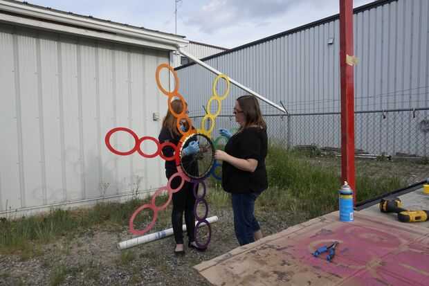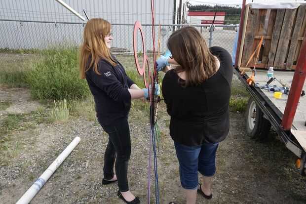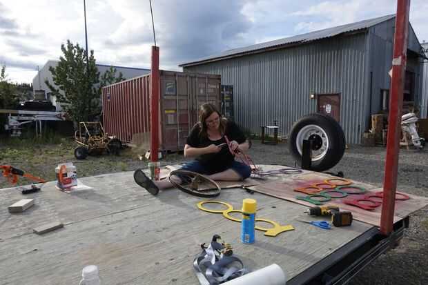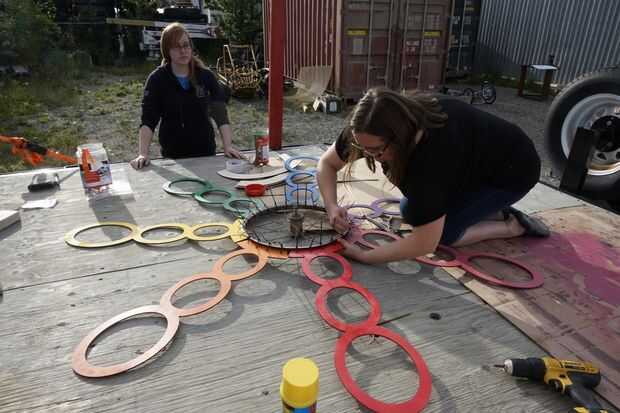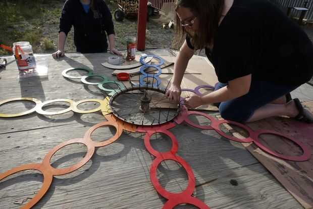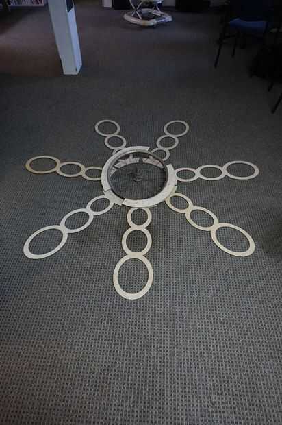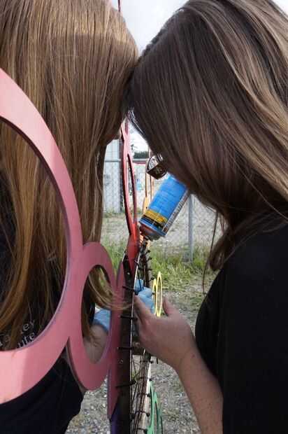 Después de atar las piezas a la rueda de zip, llenamos los huecos con espuma en aerosol para mantener los tubos rectos.