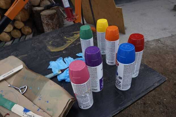 Después de cortar las piezas, hemos pintado cada varita un arco iris diferente color con pintura en aerosol.