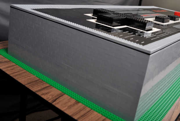Luego vino la construcción de las paredes y la base: utilizar varias placas verdes 32 x 32 en la cima de una gran mesa plegable y construyó las paredes de miles de ladrillos gris claro. Dato curioso: si se llama a las tiendas LEGO y solicitud para comprar una caja entera de un tipo/color de piezas [utilizado principalmente para el stock de la tienda en la sección de recoger un ladrillo], te venden EM que por $70 con envío FedEx gratis! Vamos a decir quiere hacer un castillo gigante de LEGO, fácilmente podría conseguir unas cajas $70 ladrillos totalmente gris, en lugar de ordenar a través de piezas en línea. Así, compré seis o siete cajas de ladrillos de 1 x 4 y 2 x 4 gris claro para las paredes. El concepto original era hacer el techo totalmente en una posición fija, con puertas en la pared frontal del regulador para hacer cualquier reparación interna. Me di cuenta que este era un método ineficiente; así quité las puertas, la pared frontal sólido y el techo desmontable en cinco grandes placas reforzadas con azulejos y adhesivos para el diseño. Si nos fijamos en las fotos de trabajo en progreso en mis anteriores posts de Tumblr, verás las primeras etapas antes del techo, cuando las puertas estaban en el lugar y las tripas del controlador se fijaron con vigas/piezas de refuerzo para soportar el techo eventual que desechado.