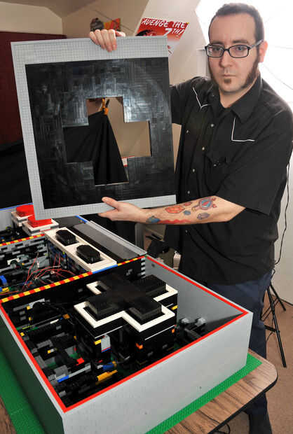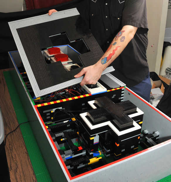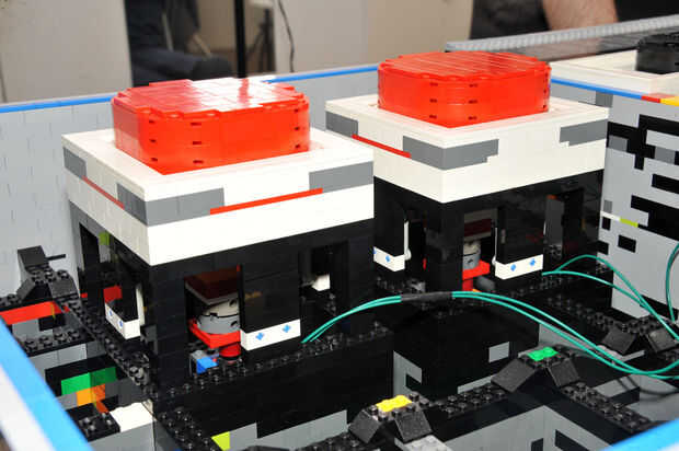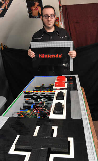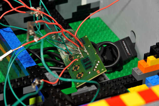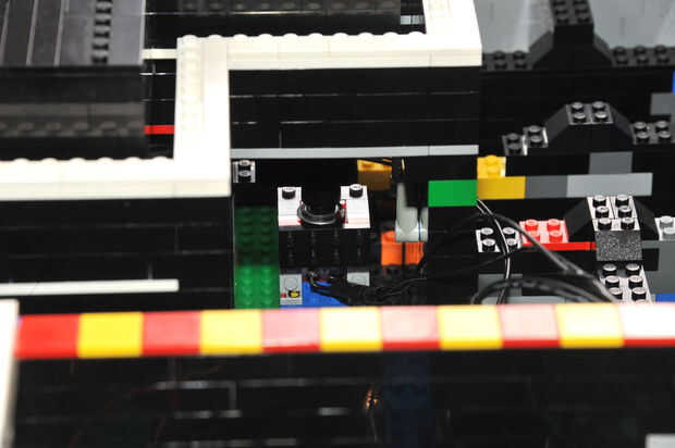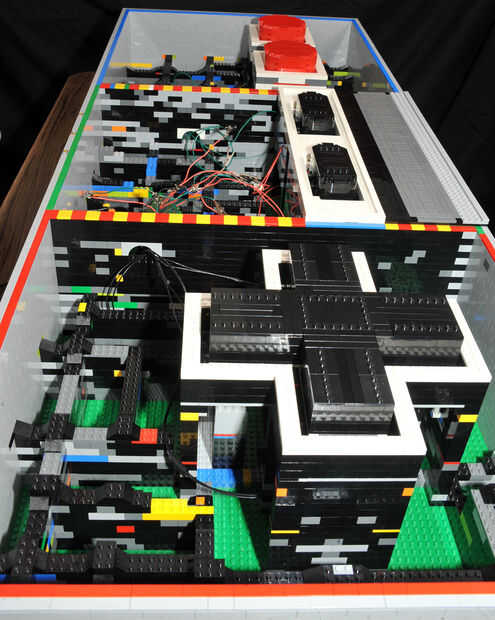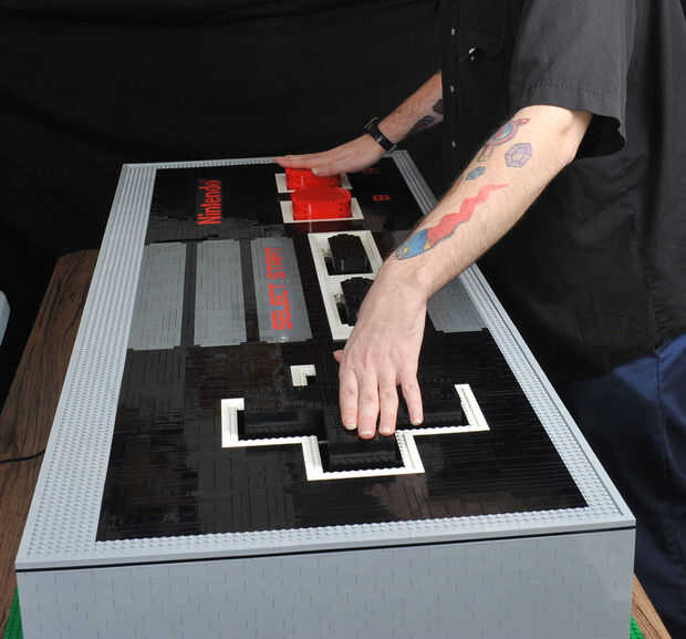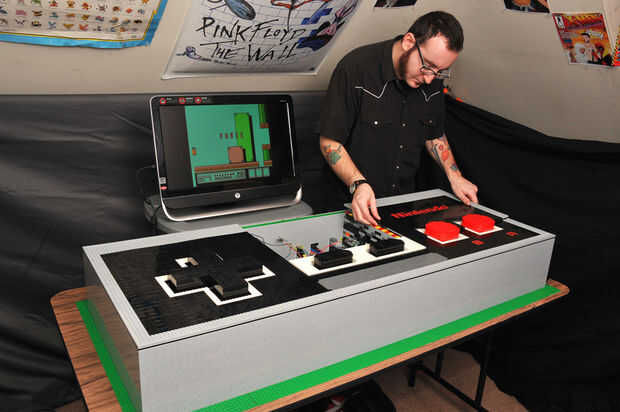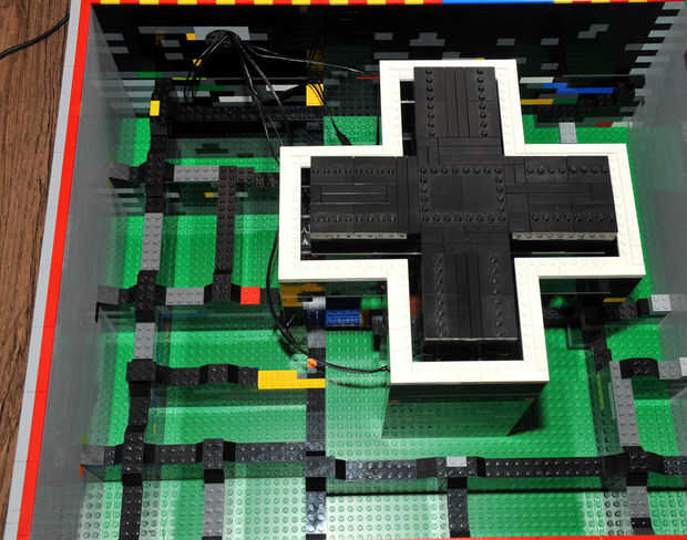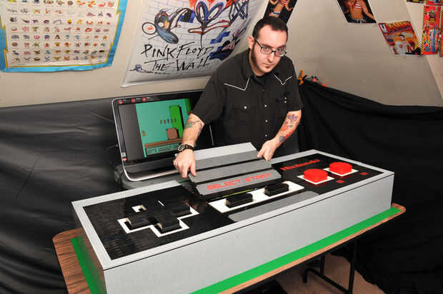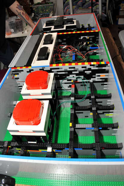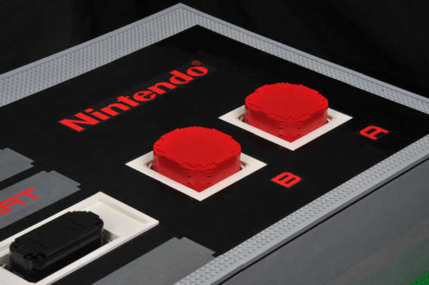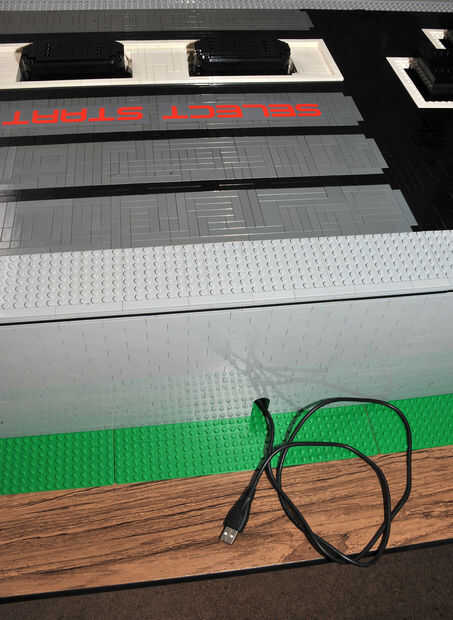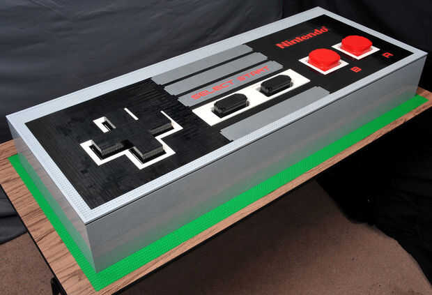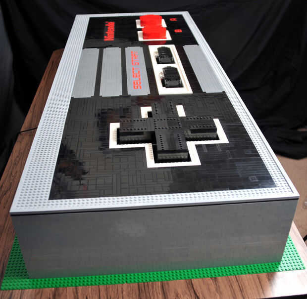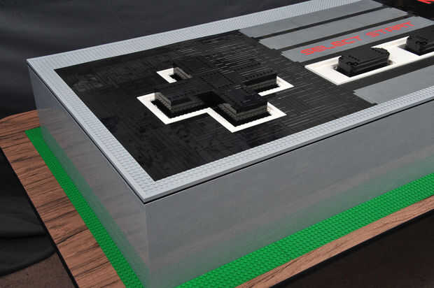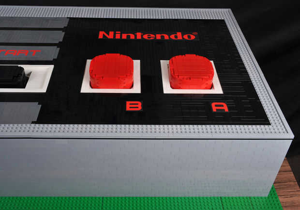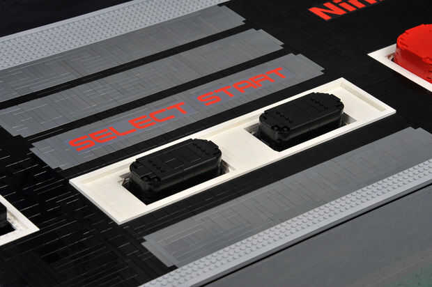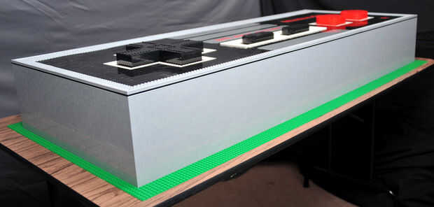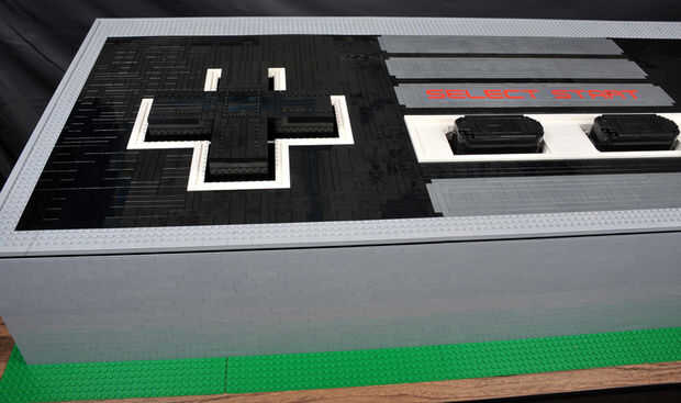 Descansando en la cima de una gran mesa plegable en mi taller ático, el regulador está construido de paredes de ladrillos LEGO de gris claro con placas removibles baldosas para el techo. Como los trabajos anteriores, he utilizado personalizados pegatinas brillantes para las etiquetas. Las vísceras son principalmente hueco con algunas armaduras y soporte para los botones. los botones son módulos con resorte usando piezas de LEGO Technic para hacer los botones grandes corresponder cuando presiona. Abajo el grande LEGO los botones son pequeños pulsadores momentáneos soldadas a la Junta del circuito real de un controlador NES original, que entonces está ligado a un convertidor USB para jugar ROMs de Nintendo en mi computadora. Cuando se pulsan los botones grandes de LEGO, los fondos hacen contacto con los pulsadores, que entonces envían la señal eléctrica hacia el circuito del controlador "del cerebro"; el sistema de suspensión de resorte LEGO Technic previene los botones grandes de conseguir pegado en lugar.