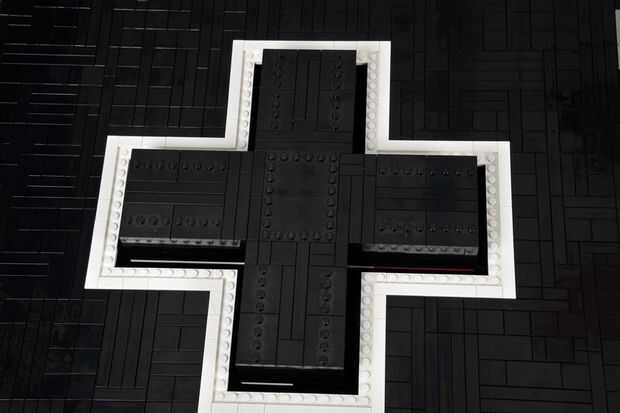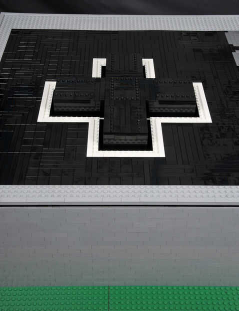 Las paredes tienen la mayoría de las piezas, pero sorprendentemente no tardaron demasiado para aguantar. De hecho, abofeteaba cada ladrillo sobre ladrillo como albañilería de mampostería, y con su forma rectangular plana con poca desviación, nos dio derecho a través del montaje de las cuatro paredes. Como se mencionó anteriormente, tenía a mi disposición varias cajas de ladrillos de color sólido que comprado en bulto de los almacenes de LEGO en Nueva Jersey y Long Island; viruta en los ladrillos gris claro significado simplemente sumergiendo en las cajas y repetir el método de ladrillo de albañilería. Las placas de techo tomaron un tiempo para construir, sin embargo; tuvieron que constantemente ser quitado y ajustado deslice firmemente en su lugar. También tuve que seguir reforzando el bajo porciones de las placas de techo para asegurarse de que no deforme en el medio. El proceso de mosaico fue también muy aburrido y desperdiciador de tiempo.