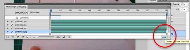 Nota: a veces cuando se abre la ventana de animación no se puede abrir con Marcos automáticamente, y se verá como la imagen de abajo. Si este es el caso, seleccione "convertir en animación fotograma" en la esquina inferior derecha.