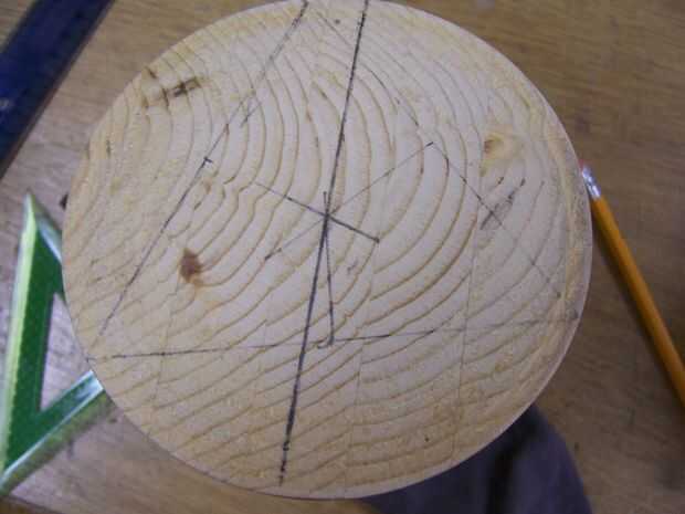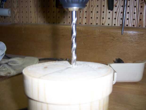 Ahora que han encontrado el centro, dibujar en el diámetro. Taladro 2 agujeros (5/16) a lo largo del diámetro, cada 1,5 cm de distancia del centro.