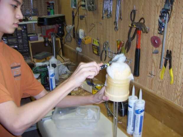 Asegúrese de que mezclar la silicona y la glicerina bien! Unte sobre el LED de madera. También sellé la base, pero más tarde esto sólo causa más dolor de cabeza, por lo que recomiendo no poner cualquier silicona en la parte inferior. Además, asegúrese de que poner bastante silicona en los labios (es fácil de poner solamente una capa delgada, que se corte después, mina igual)