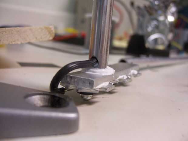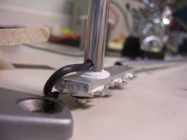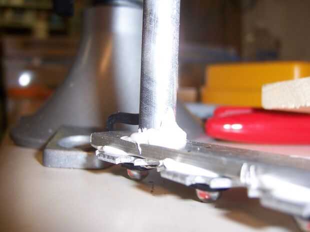 Cuando el hilo es alimentado a través, usando el pegamento termal nuevo, pegar los tubos de la base de aluminio que los LEDs se pegan a.