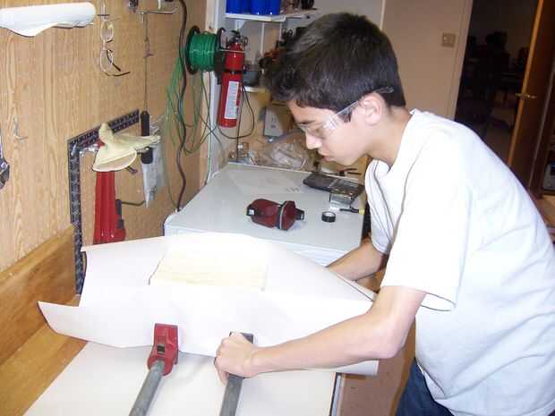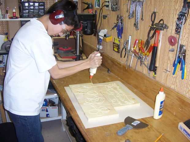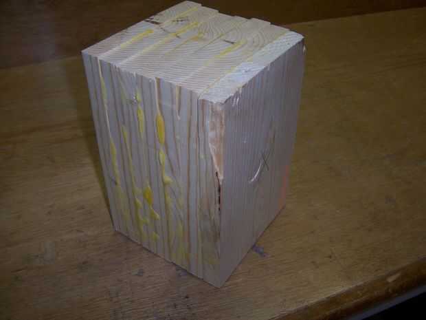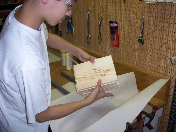 Aplique una capa delgada (no sólo Unte lo en grueso!) de pegamento en ambos lados de cada uno de ellos libre de aserrín (esto es importante) tablero y sujetarlos juntos. Tiene un secado antes de la madera del pegamento, poner las peores piezas de madera en el centro o en el exterior (medio por lo que se oculta, fuera por lo que podrá ser rechazado en aserrín). Colocar papel para que no te pegamento en sus pinzas o espacio de trabajo.