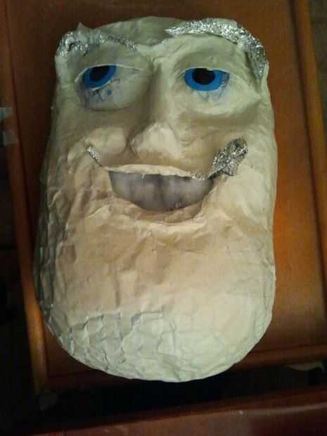 Cabeza - forma una sola pieza de tarjeta y capa de bolas de papel con cinta de enmascarar poner papel mache y colourspray en la parte superior luego tira el papel y la cinta de enmascarar de interiorcuerpo - agua a tope con saco, hecho pecho pieza de