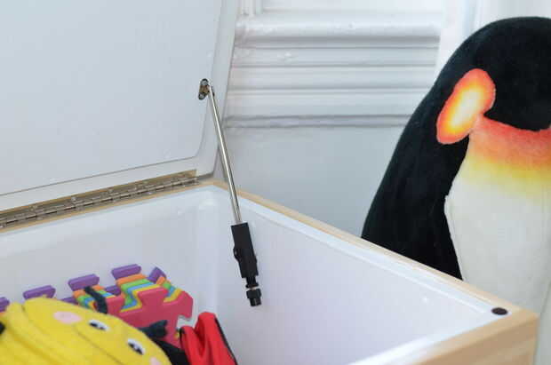 Una vez que la bisagra esté en su lugar Conecte la "aleta de estancia" al lado y la tapa. La aleta es un sorprendente aparato que permite a la caja para abrirse fácilmente, pero se puede ajustar para que cuando lo suelte de la tapa desciende muy lentamente. Puse al máximo y tarda casi 10 minutos para cerrar completamente de muy abierto. No hay manera pequeños dedos va a ser cerrado de golpe en mi caja! Si quieres empujar manualmente cerrarla también cierra muy fácilmente.
