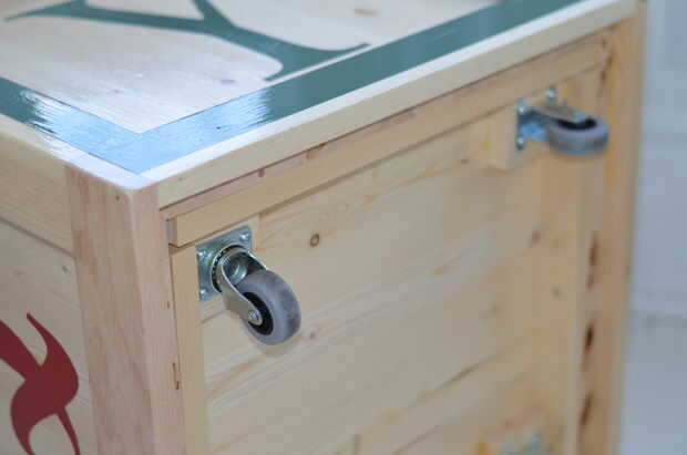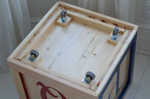 Atornille las dos ruedas del echador fijo en los bloques de nuevo dos y las ruedas del echador giratorio en la parte delantera.