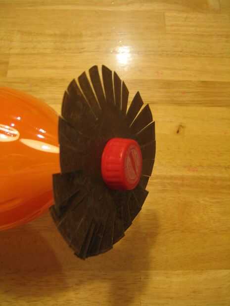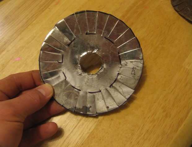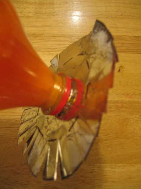 En el centro del círculo de metal, trace una línea alrededor de la boca de la botella destapada. Corte este círculo pequeño. Usé una broca pequeña primero, luego un taladro grande poco, luego terminar con las tijeras. Ten cuidado. El taladro puede coger chapa, convirtiéndose en una cuchilla girando. Fijarlo con la abrazadera hacia abajo. Guantes. Mantenga su cuerpo manos fuera del camino. El agujero debe ser lo suficientemente grande como para caber en la boca de la botella, pero más pequeño que la tapa. Cortar cuatro círculos pones uno en cada botella. Que tenga que roscar sobre la botella, sobre todo si no es perfectamente redonda. Alrededor del borde de cada círculo, cortar hacia adentro unos 2/3 del radio. Hacer un corte cada 1/2" o algo así. Use guantes y tenga cuidado de todos los filos que se está creando.