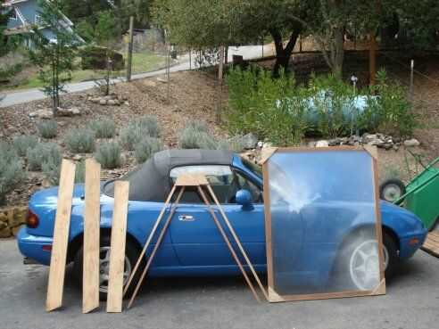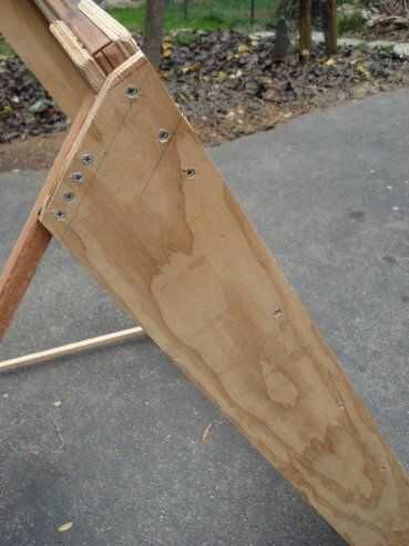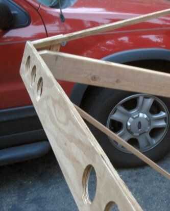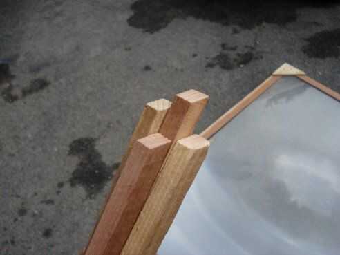 Ahora que tenemos un conjunto de lentes de enfoque, tenemos que diseñar un andamio para mantener en su lugar por delante de la lente de Fresnel. Después de una buena dosis de pensamiento concluimos que la forma más fácil es usar delgadas estacas de madera (1 x 1) por refuerzos de madera contrachapada.