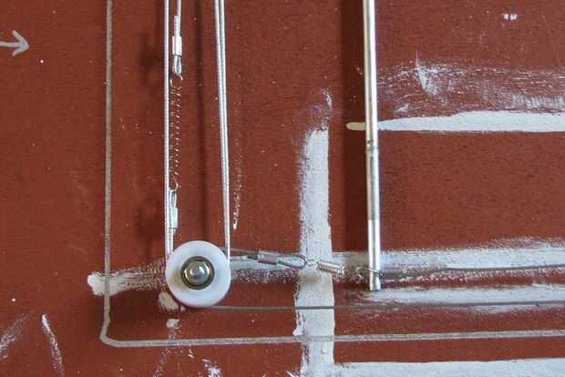 Doble un extremo de los cables en un extremo de la barra, cadena y alrededor de las poleas en un extremo para medir la longitud del cable. El final ligeramente más corto, cable corte el extremo. Usé un resorte pequeño para actuar como un tensor para mantener el lazo enseñó. Empezar por hacer los cuatro bucles conectados a cada extremo de las barras.