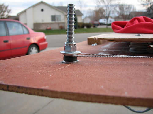 Siguiente tendrá que taladrar los agujeros para las "perillas", y pernos de rosca grande con juntas de goma. Las juntas proporcionan la fricción para mover los hilos cuando ponemos las ruedas. Medir el otro bucle de alambre de cada uno de estos puestos a las poleas adecuadas para provocar el movimiento correcto. Si no usas los resortes tensores, sólo podría ir a la parte inferior más cercana. Necesitaba más lazos de cadena y utilice una polea adicional para permitir el cableado para moverse por el cristal porque los muelles no iba a ir alrededor de las poleas.