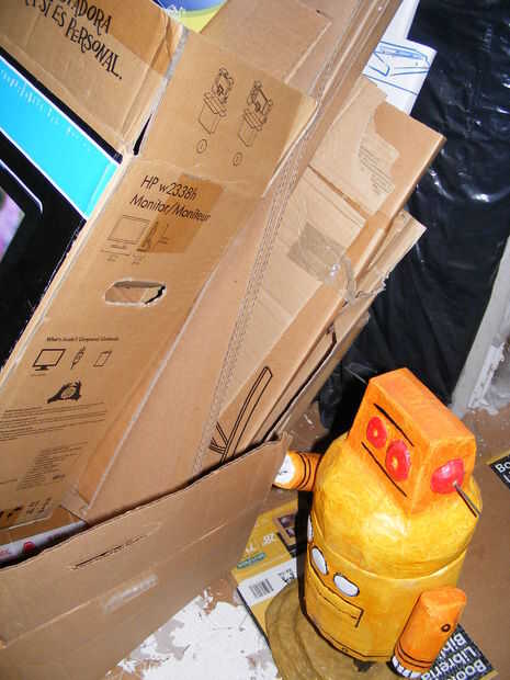 Sería bueno tener grandes hojas perfectas de cartón limpio trabajar con pero como usted verá, usted puede juntar trozos de cajas más pequeñas en lo que necesitamos. Se pela el cubierta exterior de papel de la cartulina para el uso como papel maché para un acabado liso.