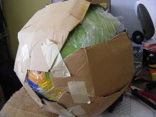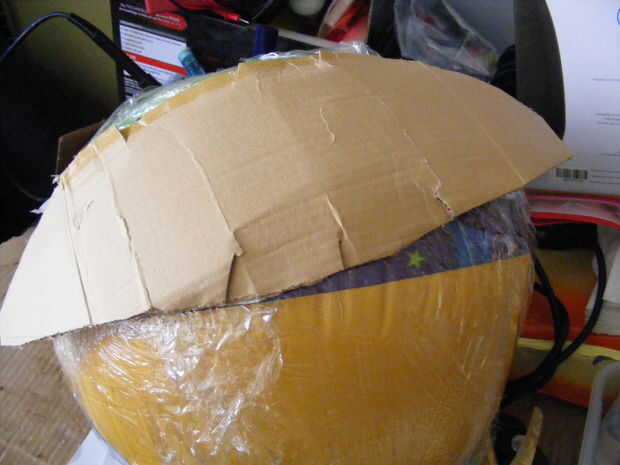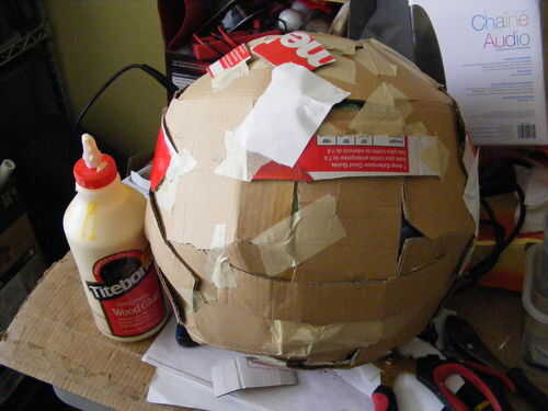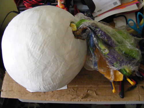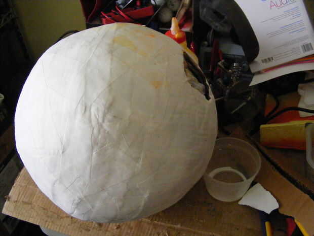 Había configuro en un rollo de cinta adhesiva para sostenerlo mientras se seca. El peso de la esfera pone una abolladura donde descansaba sobre el anillo de cinta. Tuve que parchearlo para arriba con más papel maché más adelante.