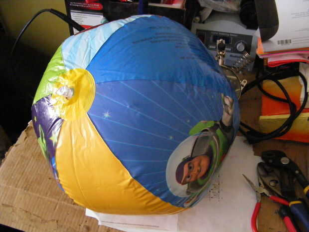Inflar el balón de playa. Tenga en cuenta que podría necesitar pinchar el mecanismo de la válvula para que aire pasa. Parece que se fabrican así con el sello intacto para que todo el mundo tiene una risa cuando ponga azul tratando de inflar la pelota delante de todos. La válvula está diseñada para ser presionado en el cuerpo después de sellado pero se puede dejar hacia fuera para tener algo que agarrar a durante la construcción,