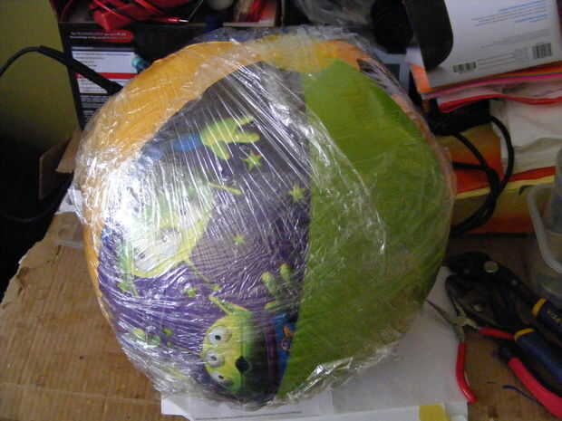 Envolver todo en plástico. Esto es opcional si desea reutilizar el balón más adelante sin todo el pegamento se adhiera a él.