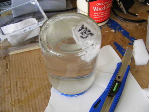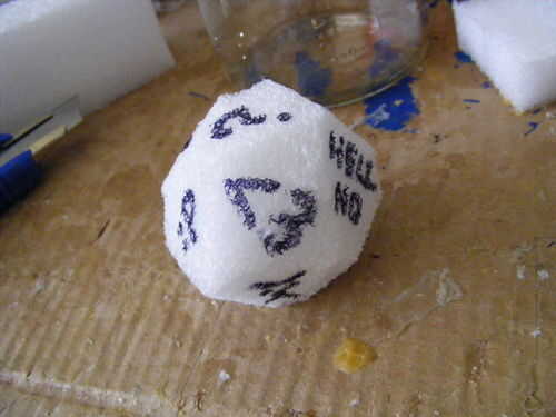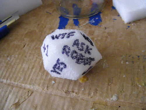 No tengo nada para crear la inscripción real de relieve que el verdadero Magic 8 Ball tiene en su dado. Probablemente tengo un rotulador dymo vieja que hace el verdadero relieve pero probablemente ninguna cinta de la etiqueta.