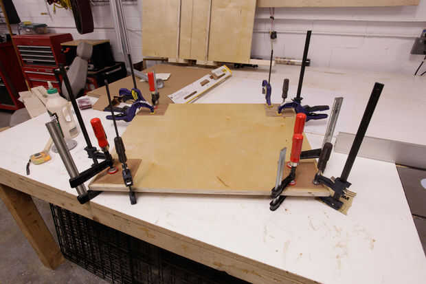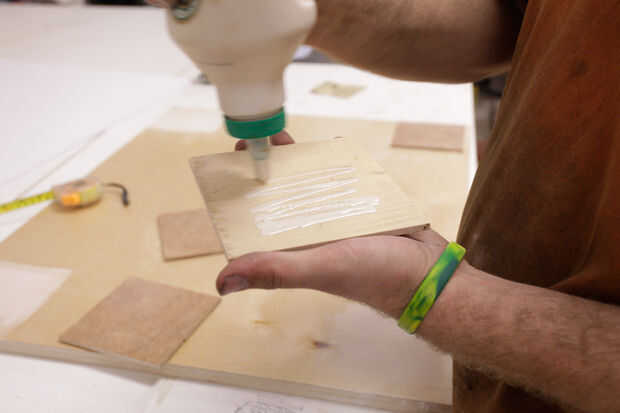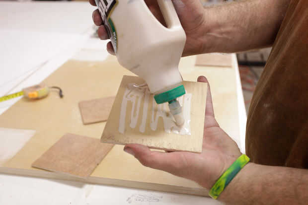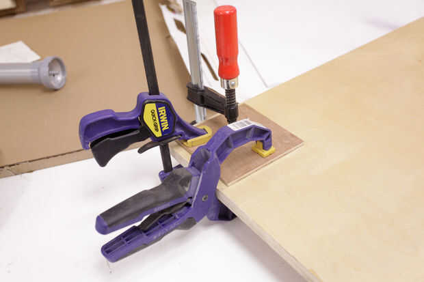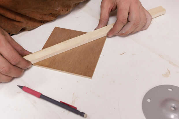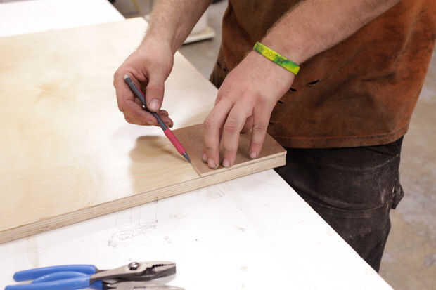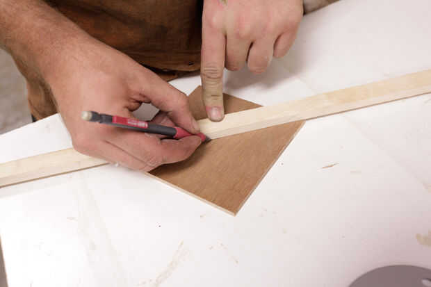 Con un borde recto, encontrar los puntos de centro de cada cuadrado de 5 x 5 y marcados con una X. Esta manera, sabía dónde Centre cada soporte sobre madera contrachapada de la servidumbre.