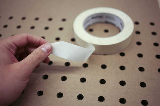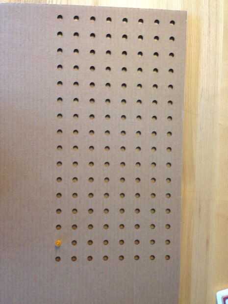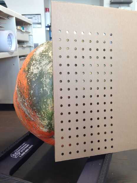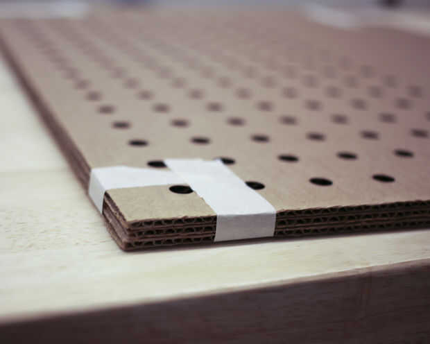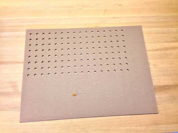 En Corel Draw, hizo una matriz de 16 x 8 agujeros de 10 mm, a continuación, utiliza un cortador láser de Epilog para cortar 3 hojas de cartulina. Cuando las hojas de la cortadora del laser, graba los juntos.