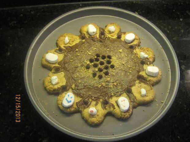 Poner los trocitos de chocolate en el centro de la pizza de galleta y entre cada una de las melcochas (como se muestra) .