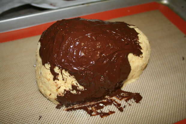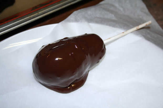 Ahora es el momento para el chocolate. Utilizamos chocolate de la panadería. He escuchado gente hablar utilizando los dulces derrite así, pero no tengo la experiencia para comparar. Para los muslos y alas, he podido sumergir y alrededor del rodillo. Puesto que los apéndices eran bastante pesados, usé una cuchara para verter el chocolate encima y cubrirla.