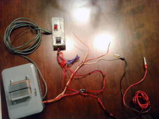 usé una vieja caja de aspersión para albergar toda la electrónica. También se utiliza una pequeña caja metálica a casa la parada e interruptores. No es realmente bonito por dentro, pero funciona y es mejor que tener todo suelto dentro del coche. Yo más tarde reconstruida la caja electrónica usando un viejo adaptador de red desde un equipo que se ve mucho mejor.