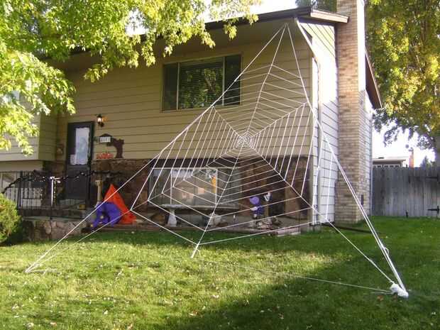 Aquí es una singular decoración de Halloween que he hecho durante los últimos dos años--una telaraña gigante en su casa! Se hace con un montón de cuerda de nylon y unos nudos simples y algo de paciencia!Lista completa de los materiales:-200' de cuer