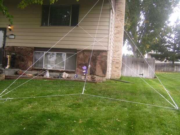 Atar dos de las cuerdas a dos anclajes en el suelo con un tirón del camionero. Un camionero es un gran nudo, pero puede ser difícil de entender si nunca has visto atado. El punto es que ata un lazo con la cuerda bien antes el ancla puede enhebrar el extremo suelto de la cuerda por el anclaje y a través del bucle. Así que has hecho una improvisado polea de la cuerda sí mismo. Esto triplica su potencia de tracción y realmente le permite hacer las cuerdas apretadas. Esto es muy importante mantener toda la web de la comba demasiado. Seguir adelante y tensar las cuerdas, como crees que pueden llevar a cabo tus anclajes.