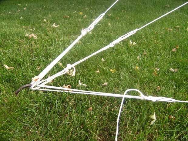Después de atar dos cuerdas del ancla de techo las anclas de tierra atan una cuerda entre las anclas de dos tierra. Utilice la misma técnica de un as de guía en un extremo y el enganche de un camionero por el otro.