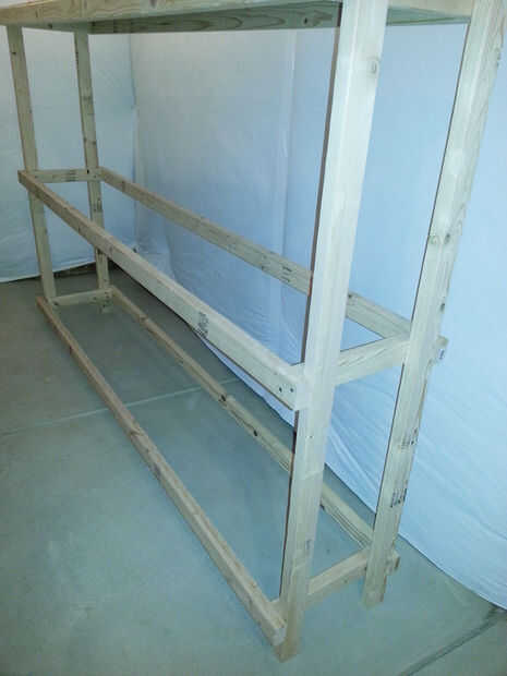 He usado clavos comunes de 3.5 pulgadas, pero tornillos drywall habría trabajado si no te importa taladrar un agujero piloto para evitar que se resquebraje. Puse un clavo en el extremo del lado de 13 pulgadas y uno en la vertical. Repetir este proceso para todas las longitudes de seis. Es mucho más fácil poner la unidad en su lado cuando se hacer esto, hacen tres de 8 pies de largo, por un lado, cuidadosamente voltear todo y luego hacen las otras tres en el otro lado.